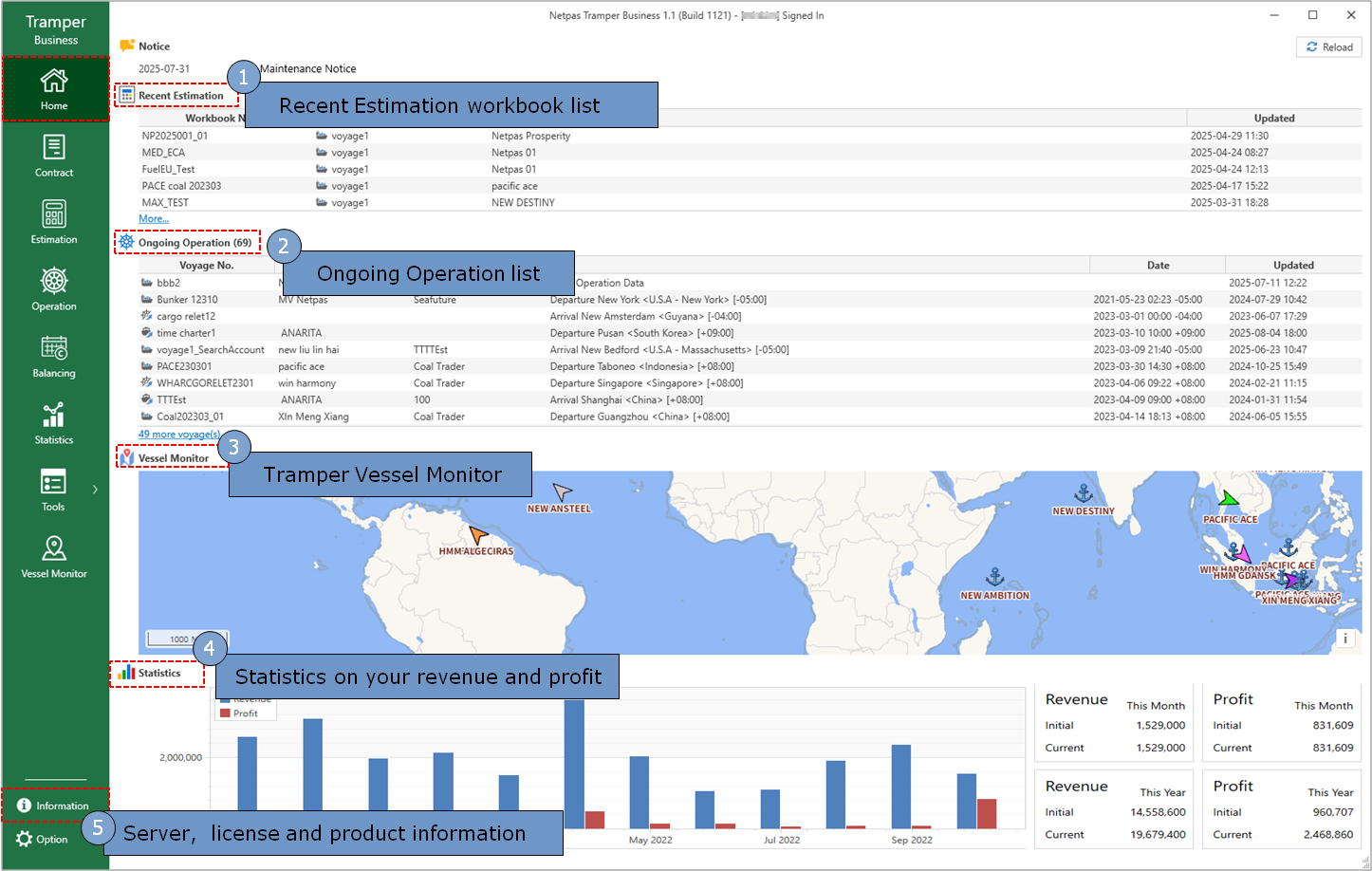It is the main portal page where the recent Estimation Workbooks, Ongoing Operations, Vessel Monitor and Statistics are summarized at a glance for your quick review and easy access.